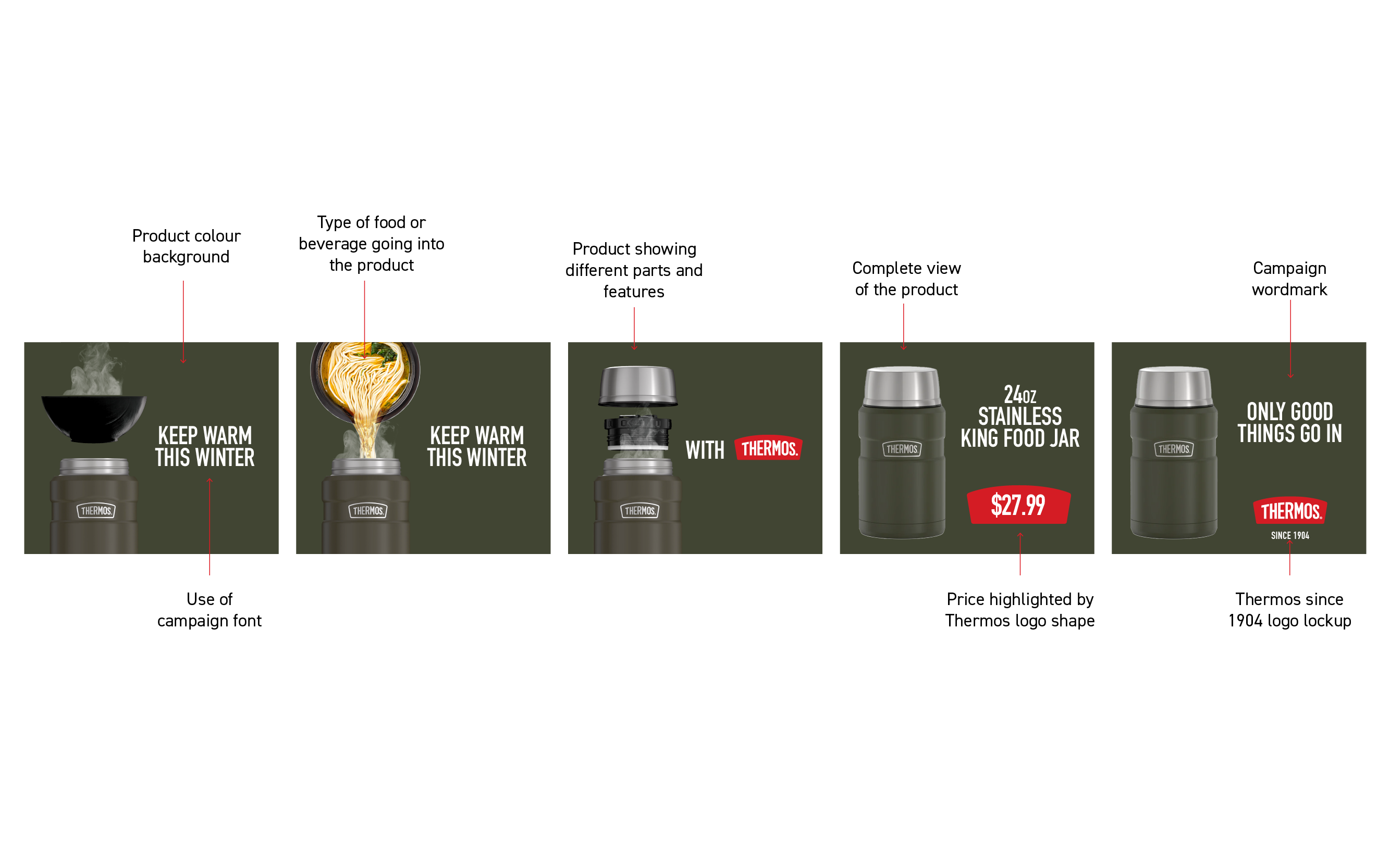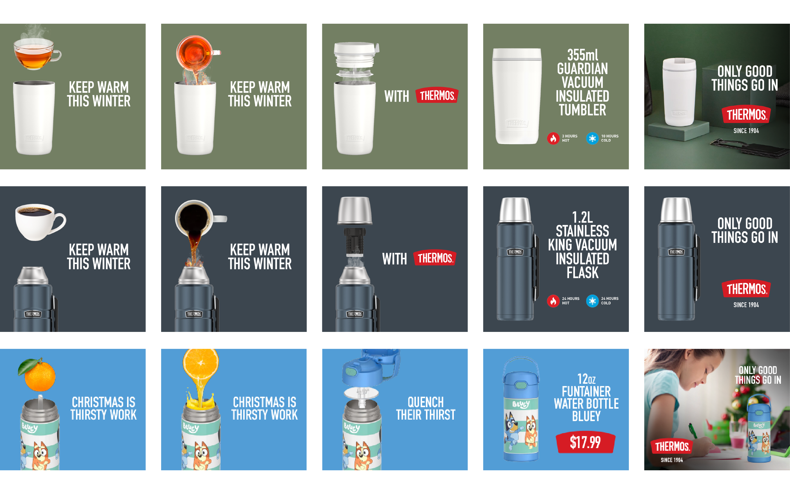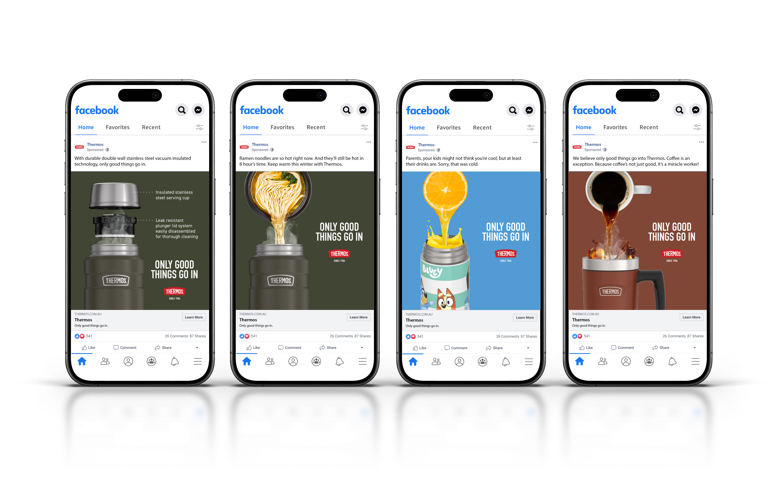 Each ad translated the brand’s tone of voice into short-form, platform-native content that felt warm, human, and genuine. Inspired by the original 1904 double-walled Thermos, the creative direction focused on being relevant, robust, and reliable. From static ads to video storytelling, every piece was designed to keep the message simple, relatable, and true to the brand’s heritage.